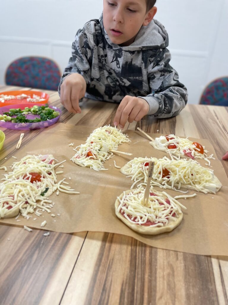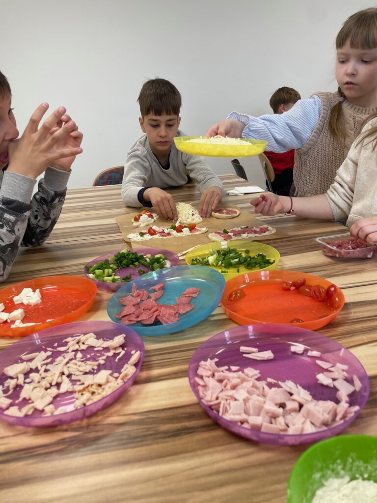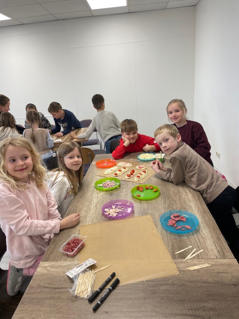 Im Anschluss an die Andacht arbeiteten die Kinder in gemischten Gruppen in verschiedenen Workshops weiter. Dabei konnten sie einen Tag im Wald verbringen, beim Basteln eine „wunderschöne Welt in einem Schuhkarton“ gestalten, beim Pizzabacken entdecken, wie gut Gott für uns sorgt, oder in einem aktiven Parcours mit allen Sinnen spannende Aufgaben erleben.