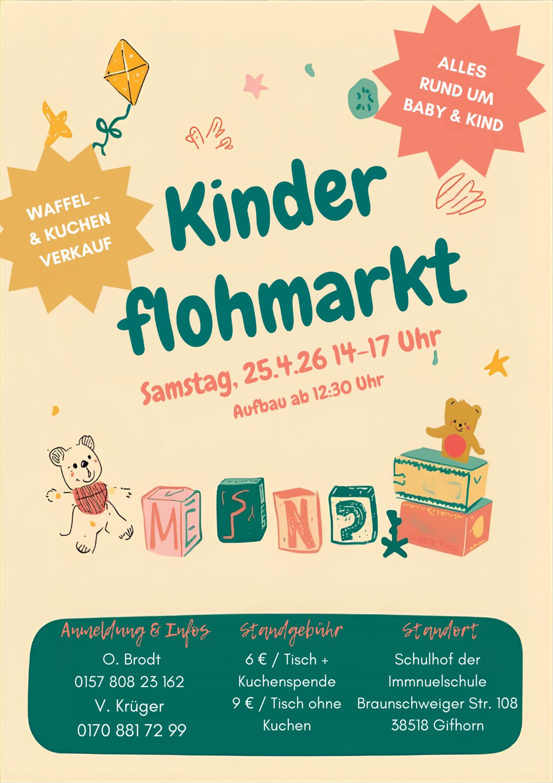 Am Samstag, den 25. April 2026 von 14 bis 17 Uhr findet auf dem Schulhof der Immanuelschule (Braunschweiger Str. 108, Gifhorn) ein bunter Flohmarkt rund um Baby & Kind statt – mit Waffel- und Kuchenverkauf 🍰🧇.